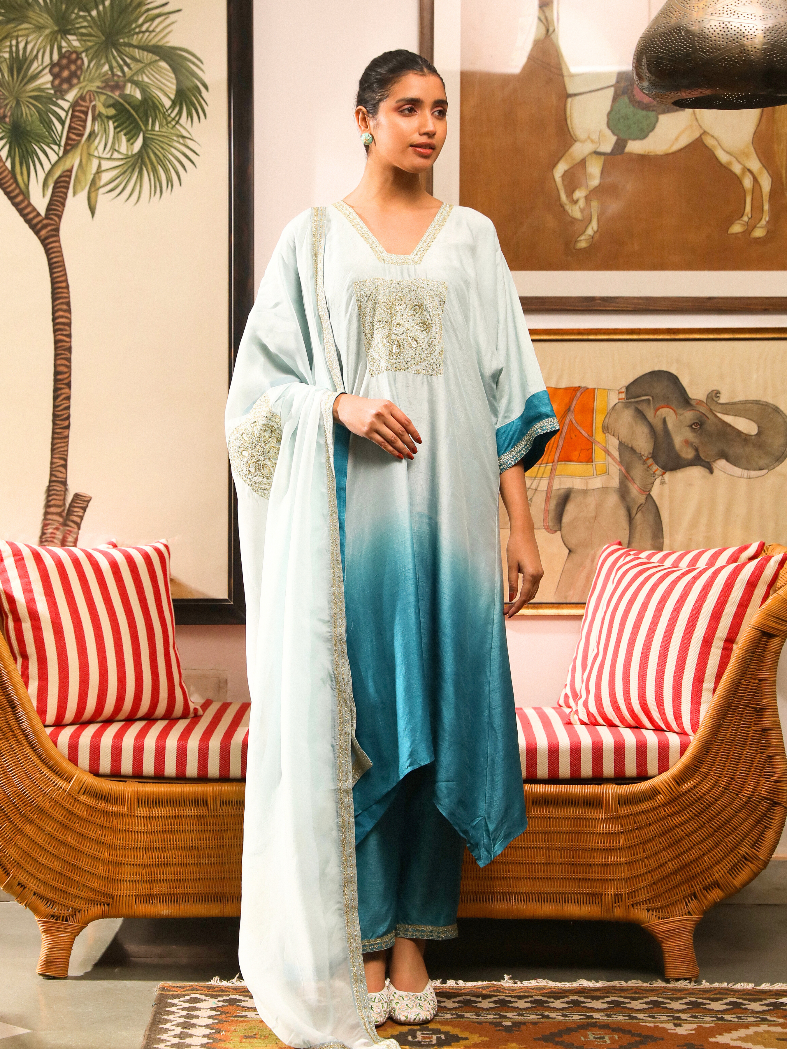 The asymmetric kurta features an ombre effect, starting with a serene sky blue on top and gradually deepening to a rich aqua blue at the hem. This seamless gradient adds a touch of ethereal charm to the ensemble, making it a visual delight. The kurta set comes is a relaxed kaftan silhouette making it a perfect choice for comfort and on point style statement.