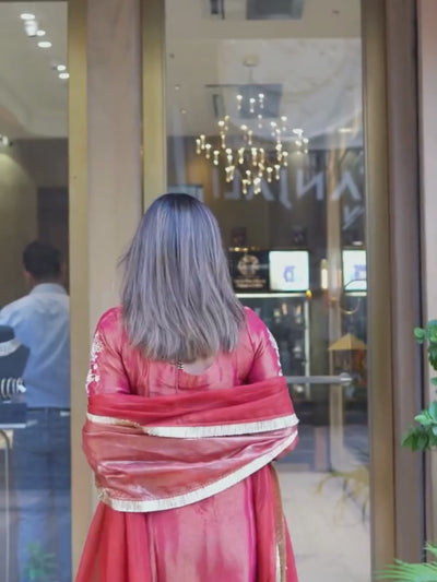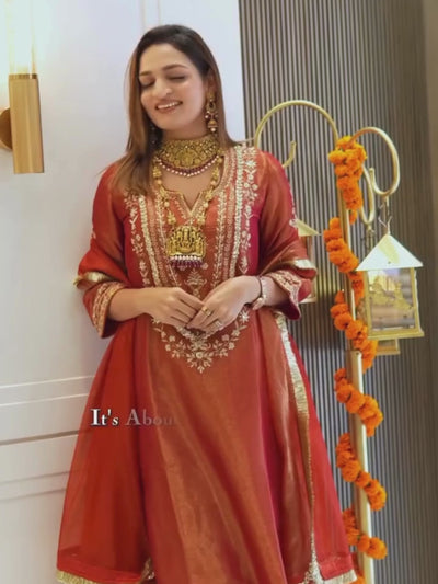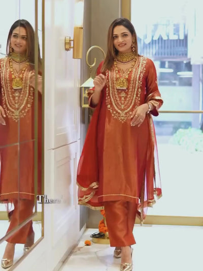 The Irum Kurta Set exudes festive elegance in a beautiful rust-orange hue, highlighted with precise and intricate embroidery. Crafted to suit every occasion, this ensemble is elevated by shimmer tissue that adds a subtle sparkle and graceful charm. Perfect for festive gatherings, the Irum Kurta Set effortlessly blends tradition with modern sophistication.