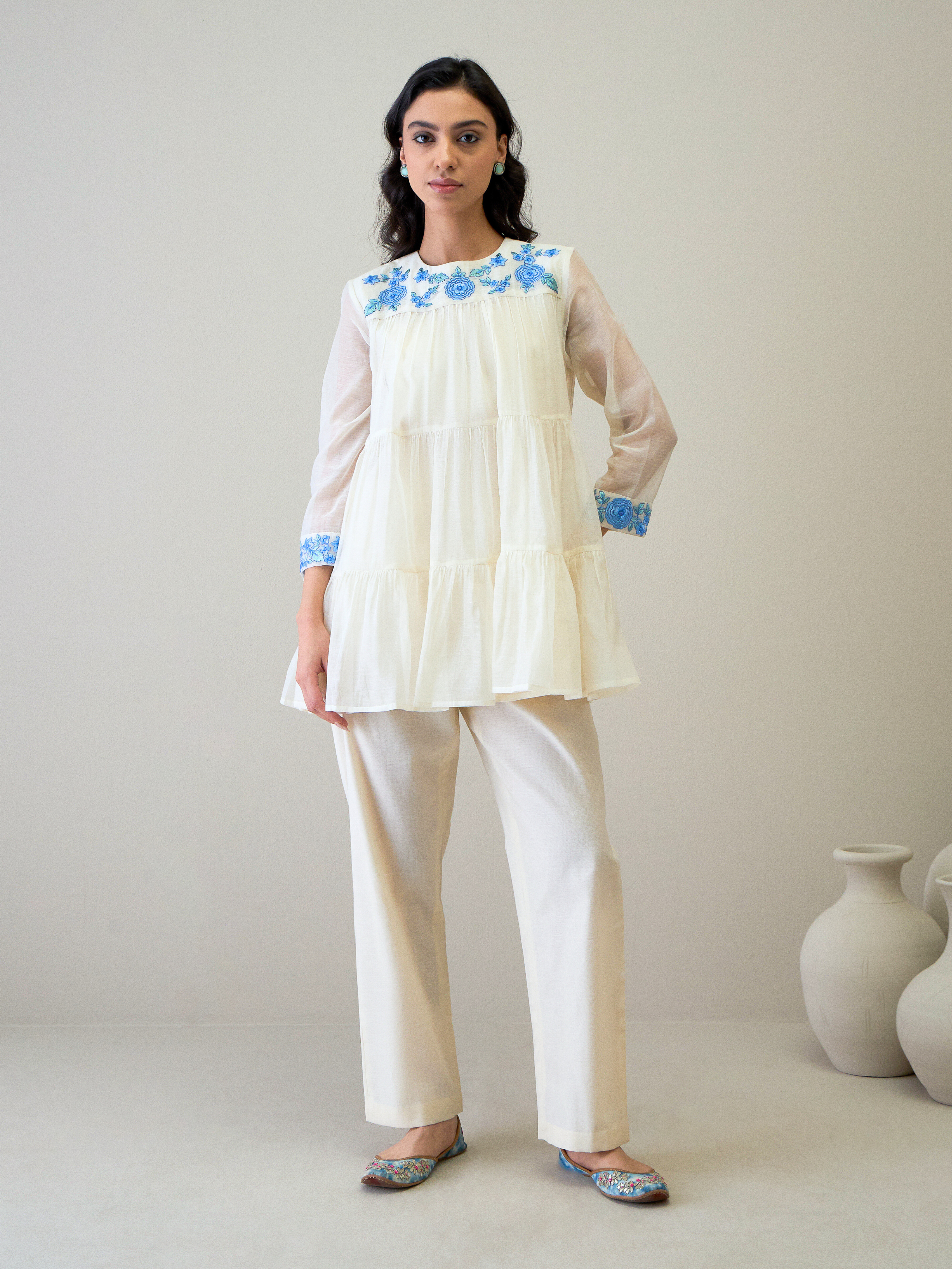 At the heart of this short-tiered kurta lies its captivating feature: exquisite floral embroidery adorning the top. Each stitch is a work of art, adding a touch of romance and whimsy to the ivory canvas. Whether you're attending a garden party or an intimate gathering, this kurta is sure to make you feel like a vision of summer beauty.