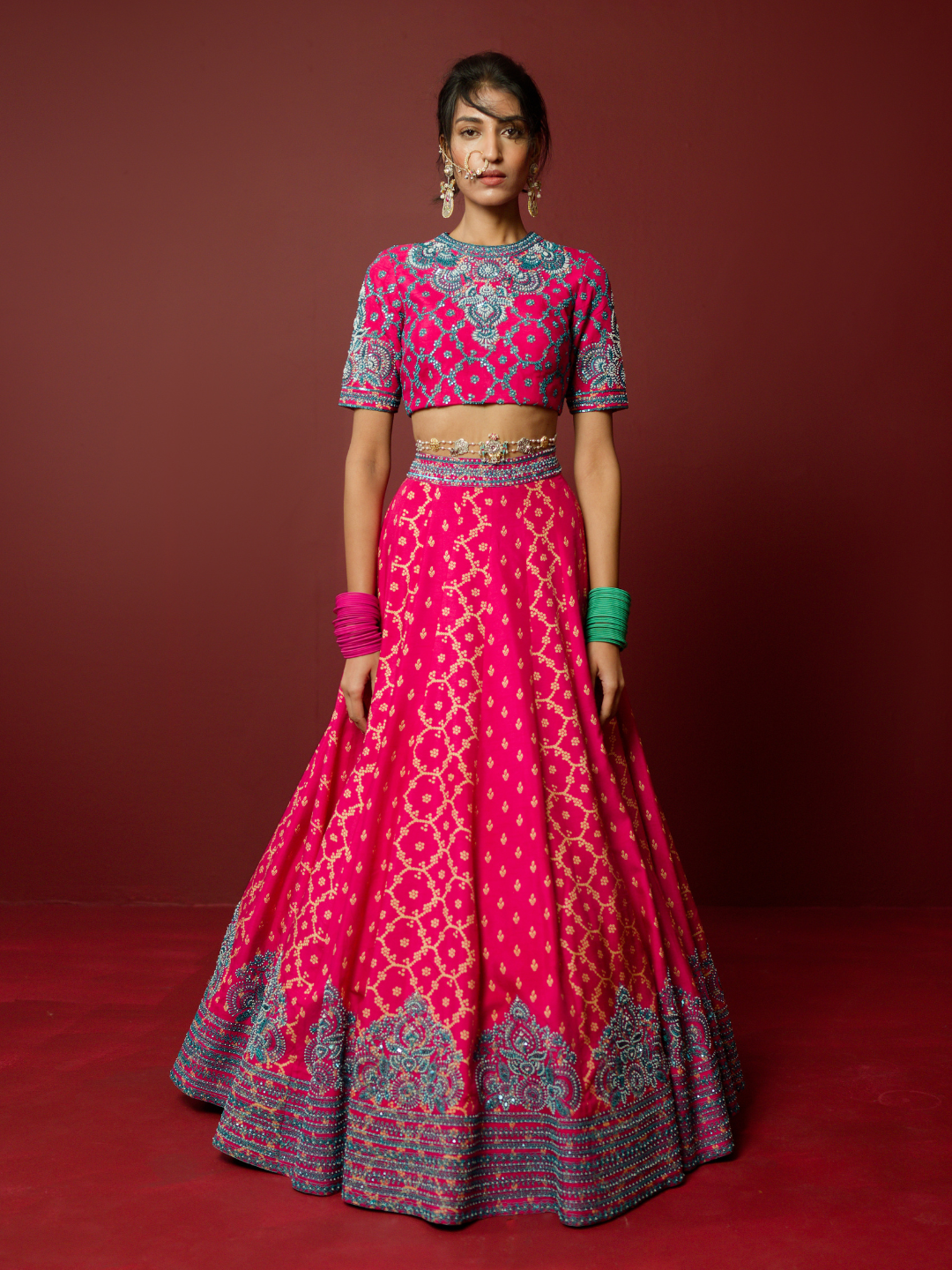 Kaushika is derived from "kosh", which means "cocoon of a silkworm" The lustrous Kaushika lehenga defines the unique play of colors and patterns. The blissful color story amalgamated with distinctive crafting marks it as one of a kind ensemble.