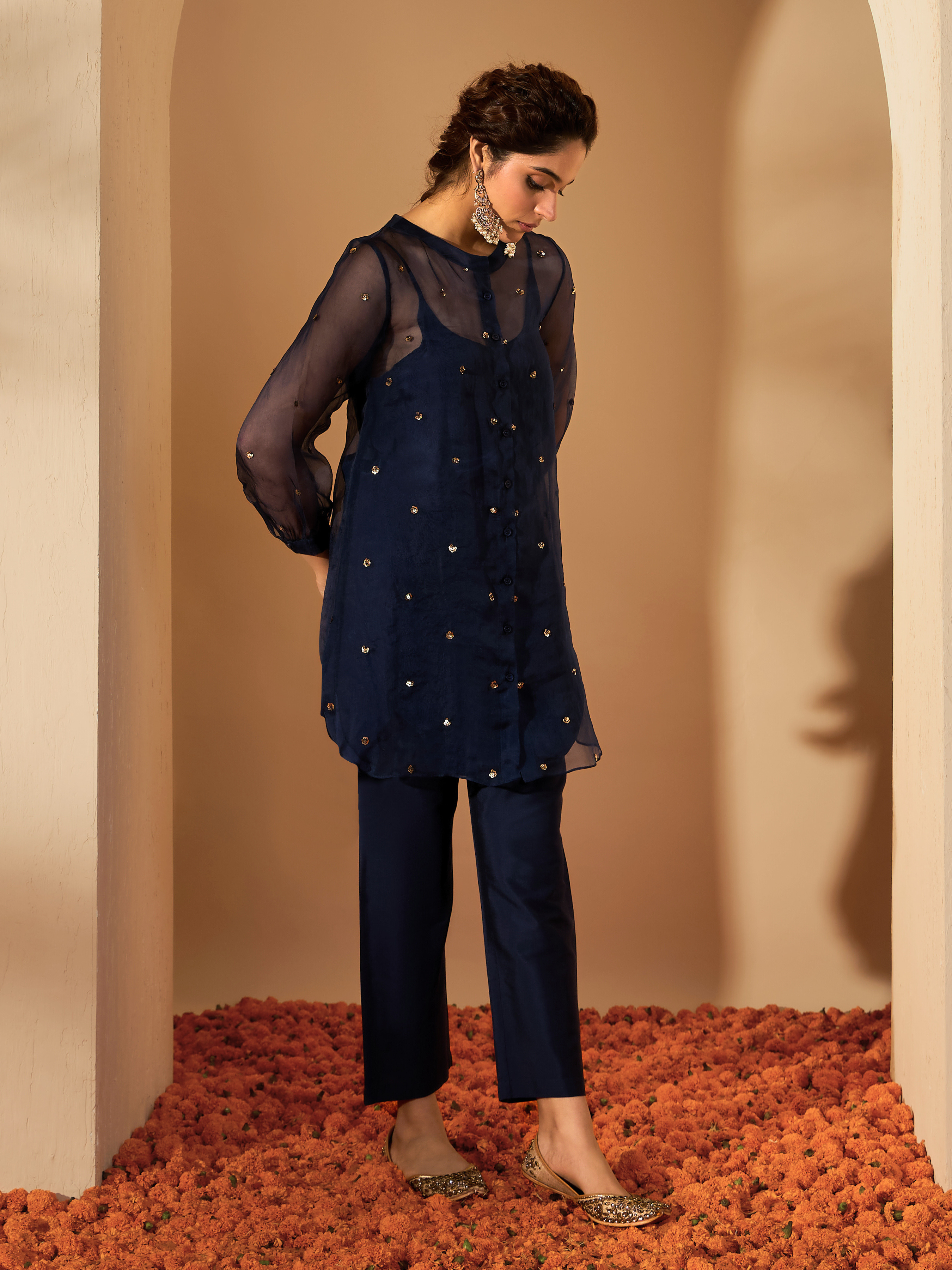 A hand sequin embroidered kurta set with tonal straight pants. The kurta set comes with a tonal cami lining. The outfit is super versatile, and is a perfect choice for all your festive needs. The outfit can be minimal yet classy.