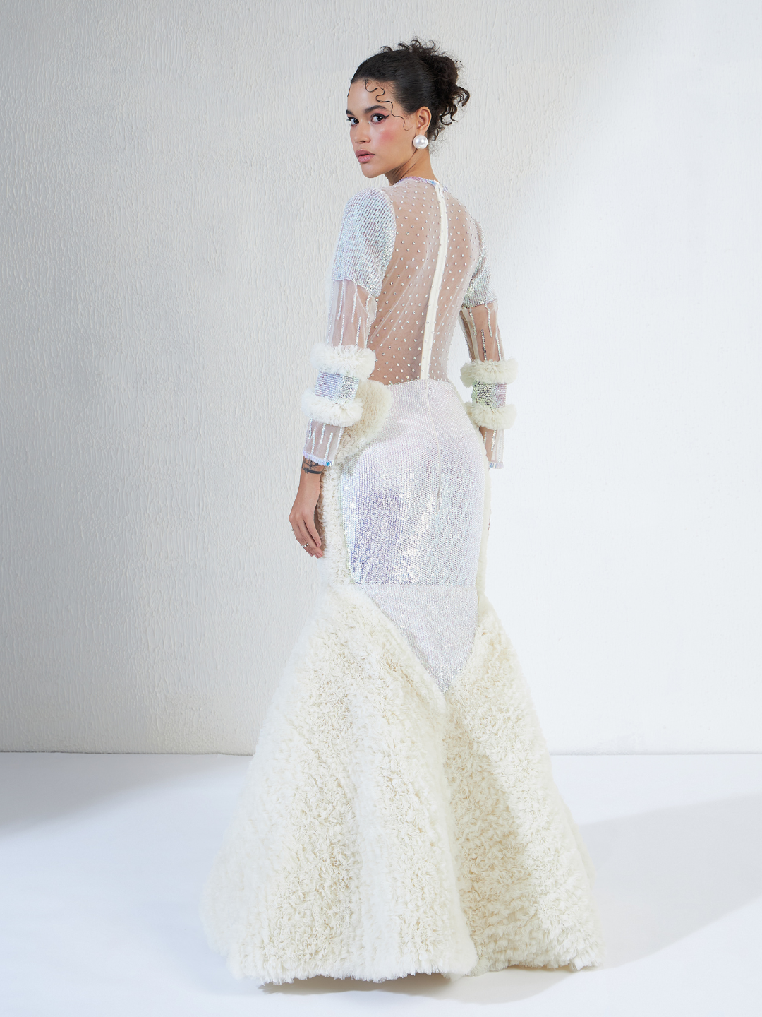 Solitary Crystal Gown is like a blank page in the book of life which represents the limitless potential of new beginnings and the purity of our intentions. It encourages us to craft our narratives with grace and authenticity, akin to the gown's elegant design. The intricate crystal-embellished tulle overlays symbolize the complexities and intricacies that define our journey.